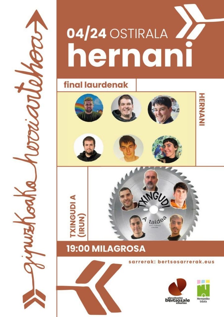 Aipatutako saioa apirilaren 24an, ostiralean, izango da eta 19:00etan emango zaio hasiera. Bertsotan “Txingudi A” taldeko Igauri Lopetegi Amostegi, Manu Goiogana Bengoetxea eta Jon Luzuriaga Iurramendi eta “Hernani” taldeko Ekain Tolaretxipi Errazti, Unai Agirre Goia eta Eñaut Martikorena Lizaso ariko dira; gai jartzen, Jon Cia Insausti eta Markel Oiarzabal; epaile lanetan, berriz, Aitor Errazkin Vicente eta Ainara Azpiazu Aduriz “Axpi”.